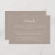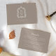 I den här eleganten finns ett kort för aktuell information om höljet i bröllop med klassisk vit text i en taupbakgrund. På baksidan av kortet omger en vit vapensköld av vintagen utandning av sädesvätska parets monogram initialer, med nedanstående datum för namn och bröllop.