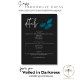 Den här bröllop-kortdesignen har en mörk, ett moody tema som är enkelt, men ändå häpnadsväckande. En svart bakgrund i mörk är perfektens arbetsyta för en enda tealblått matt, dess spridning i vingar för flygning. Unik och elegant, den här utformningen kan användas för vilken säsong som helst. Skapat av Farmhouse Press.