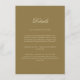 Ett förfinat minalistiskt bröllop-kort designat i en tidlös guld-bakgrund med elegant-skript. Perfekt för att dela viktig information, t.ex. logi, pendelschema eller mottagningsinformation med dina gäster. Det här kortet kompletterar alla moderna eller klassiska bröllop-svit och behållor som är sammanhängande och snyggt för bröllop-stationerna.