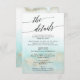 Kortet för resetjänster för akvarier och guld är perfekt för ett tropiskt badbröllop. Den enkla och moderna designen har en fantastisk turkos, teal- och ljusblå vattenfärg med en mjuk guld-gnistra som påminner om sand och hav. Den är parad med en fantastisk elegant-kalligrafi. Obs! Den här designen har inte guld glitter. Det är en högkvalitativ grafik som framstår som en småaktig gnistra i guld.