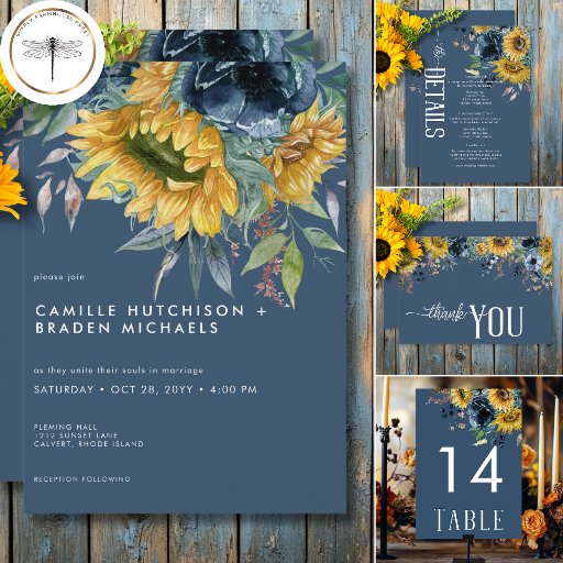 Fira värmen och viskheten i kärlek med det här häpnadsväckande detaljkortet för solrossen bröllop. Solblommornas pulserande gult och bruna nyanser, kompletterade med dammiga blåvallar och lush grönt foliage, skapar en fängslande och glatt atmosfär. Med den mörk blått bakgrunden får du en aning sofistikering, medan det vita teckensnittet ger ett modernt utseende och elegant. Denna utformning är perfektens val för en sommar bröllop, som fångar själva kärnan av lycka och firande. Låt dina gäster dras in i din speciella dags värme och skönhet med den här fantastiska designen. Skapat av Farmhouse Press.
