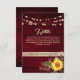 Elegant, land, rustiskt träburgundkort för bröllop med webbplats, solros, vintage guld blommigt snöre och ljus.