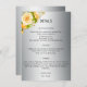Ett boho-kort för alla viktiga uppgifter som gästerna kan få kännedom om i silver blommigt bröllop i elegant. Det här vintage-inspirerade kortet har en metallisk silver-bas med ett söt guld bukett med rosor i det övre lämnat hörnet. Alla detaljer i varje stycke kan enkelt personlig till kostym på mallen. Kortets baksida är en vanlig silver-övertoningsbakgrund, med en mindre version av gul ros-arrangemanga som ligger grund på kortet med din webbplats adress sitta överst (observera att om den här linjen inte behövs kan den enkelt tas bort genom att bara ta bort den här raden på menyn Personalize).
