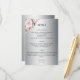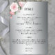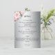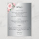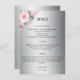 Ett bröllop-kort för blommigt med silver-bakgrund med söt rosa ros överst till lämnat på kortet. Alla detaljgrupper och detaljgrupper kan enkelt ändras på anpassningsmenyn och vissa stycken kan tas bort helt om de inte behövs. På baksidan av informationskortet finns samma metalliska silver/grått-bas, med plats för en webbplats i grund (om det inte behövs kan du enkelt ta bort den här raden) med en enda rosa ros-bukett i grund under.