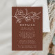 Elegant blommigt bröllop innehåller detaljkort med vita skissade blommor och löv nära överkanten av designen med en brun bakgrund. Anpassa det botaniska bröllop-detaljkortet med dina bröllop-uppgifter nedan i klassiskt vitt brev. Designad att samordna med vår Sketched Blommigt bröllop samling.