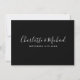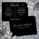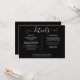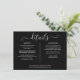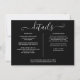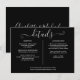 Ett elegant informationskort med detaljer om bröllopet, personligt anpassat med era speciella detaljer i stilfull typografi och era namn och bröllopsdatum på baksidan mot svart bakgrund. Designad av Thisisnotme