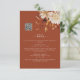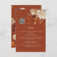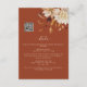 Terracotta Fall Details-hölje-kort. Se till att gästerna har all nödvändig information till sitt förfogande med det här med information om lodrät och ett bekvämt QR-nummer. Konstruktionen visar att man andas handmålade vattenfärgsbilder av bränd orange och terracotta löv, krämbeige beige dahlias och pulserande koppar och rostfritt färgad ro, som alla ställs mot en varm kopparbakgrund. Blanda elegans med bekvämlighet - anpassa ditt informationskort nu.