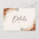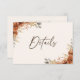 det viktigaste med elegans med det här detaljkortet för rustik, designat i varma terracotta-toner och rik fallande blommigtar. Perfekt för boho, utomhus eller rustiskt bröllop, det här kortet för höljet tillför en nyare charm till din inbjudan. Oavsett om du firar i naturen eller en mysigt plats ger det här kortet all viktig information om mottagning och logi som dina gäster behöver. Om du blandar tidlös stil med minimalistisk charm är det perfektens följeslagare till dina höstinspirerade bröllopsinbjudningar.