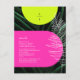 Neon rosa och gult samlas över mörk handflatan löv, med lodrät som monogram vid övre och vita linjen handflatan löv vid högerna. Anpassa den vita texten med mottagningsdetaljer, mottagningsutrymmen osv.