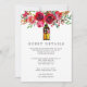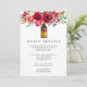 Romantisk blommigt bröllop-gästkort med uppgifter om lantern och rött, lila, rosa och burgundisk ro och peonier.