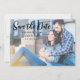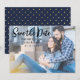 Horisontellt sparadatumkort. Denna design har ett avslappnat utseende och känsla. På baksidan finns en mörkblå bakgrund med guldprickar.