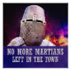 Stängningsyta av hjälm och en plåtsvävare av medeltida riddare mot den färgstarka bakgrund som påminner om rymden eller ett slagfält som du tycker om. Text - Inga fler martianer lämnat i staden - tillagda
