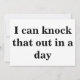 Ett vanligt vitt kort med "Inget problem!" på framsidan och "jag kan knacka ut det på en dag" på baksidan. Texten är i ett stort fet svart teckensnitt på båda sidor.