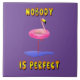 Ta med humor och charm till ditt space med den här snabba designen "Ingen är Perfekt" som har en avslappnad flamingo som flyter i en rosa som simmar ring. Den här roligten och öga-fångstdesignen är perfekt för flamingo älskare, sommarvibes och alla som njuter av ofullkomlighet med ett leende, mot en djärv lila med lekfull 3D-stil-gult. Perfekt för presenter, hemdekanter och tillbehör!