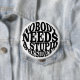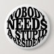Objektets motiv visar en vit bakgrund med svart, fetstilt text i stort brev. Texten lyder: "INGEN BEHÖVER EN STUPID PRESIDENT" Utformningen är enkel och direkt, med ett starkt, blockerat teckensnitt som förmedlar budskapet tydligt.
