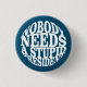 Objektets motiv visar en vit bakgrund med svart, fetstilt text i stort brev. Texten lyder: "INGEN BEHÖVER EN STUPID PRESIDENT" Utformningen är enkel och direkt, med ett starkt, blockerat teckensnitt som förmedlar budskapet tydligt.