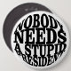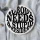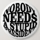 Objektets motiv visar en vit bakgrund med svart, fetstilt text i stort brev. Texten lyder: "INGEN BEHÖVER EN STUPID PRESIDENT" Utformningen är enkel och direkt, med ett starkt, blockerat teckensnitt som förmedlar budskapet tydligt.