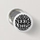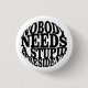 Objektets motiv visar en vit bakgrund med svart, fetstilt text i stort brev. Texten lyder: "INGEN BEHÖVER EN STUPID PRESIDENT" Utformningen är enkel och direkt, med ett starkt, blockerat teckensnitt som förmedlar budskapet tydligt.