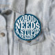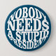 Objektets motiv visar en vit bakgrund med svart, fetstilt text i stort brev. Texten lyder: "INGEN BEHÖVER EN STUPID PRESIDENT" Utformningen är enkel och direkt, med ett starkt, blockerat teckensnitt som förmedlar budskapet tydligt.