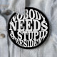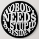 Objektets motiv visar en vit bakgrund med svart, fetstilt text i stort brev. Texten lyder: "INGEN BEHÖVER EN STUPID PRESIDENT" Utformningen är enkel och direkt, med ett starkt, blockerat teckensnitt som förmedlar budskapet tydligt.