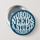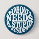 Objektets motiv visar en vit bakgrund med svart, fetstilt text i stort brev. Texten lyder: "INGEN BEHÖVER EN STUPID PRESIDENT" Utformningen är enkel och direkt, med ett starkt, blockerat teckensnitt som förmedlar budskapet tydligt.