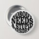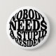 Objektets motiv visar en vit bakgrund med svart, fetstilt text i stort brev. Texten lyder: "INGEN BEHÖVER EN STUPID PRESIDENT" Utformningen är enkel och direkt, med ett starkt, blockerat teckensnitt som förmedlar budskapet tydligt.