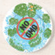 En global fråga för den miljövänliga gröna hållbara organiska konservativa biologin huvudsakligen oroad och medveten med budskapet INGEN GMO och en jordglob med Nordamerika och toppen av Sydamerika med träd, fåglar, pingviner, havsvågor, virvlar och en stor röd NEJ-skylt