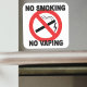 Ingen rökning Varningsskylt för förångning med ikoner för cigarett, e-cigarett och rött snedstreck.