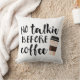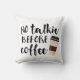 Om du absolut inte kan tåla tänka om konversation innan du har haft morgonsamröre, så gå till dekorativ kudde. Utformningen innehåller texten "No Talkie before Coffee" i svart handskriven stil med en illustration av kopp på ett sjökaffe.