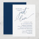 Meddela och dela er lyckliga framtid med stil med vår moderna design i marinblått tema (Nothing Fancy Just Love) för bröllopsinbjudan för en intim vigselceremoni. Det är perfekt för par som har bestämt sig för att fira sin speciella dag. Med sin sofistikerade men ändå lekfulla design kommer denna inbjudan säkert att sätta tonen för en oförglömlig händelse. Inbjudningskortet har ett modernt och minimalistiskt manusdesigntema som ger en touch av tidlös elegans till er fest. Designad av TeeshaDerrick