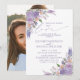 Skapa den perfekta inbjudan för ett avslappnat bröllop eller efterbröllopsfirande med denna moderna, trendiga, lila lavendel-färgade vattenfärgblommor och handskrivna typsnitt. Designen visar ditt favoritfoto på baksidan av kortet. Kontakta designern för matchande produkter. Tack så mycket för att du stöttar vårt lilla företag, vi uppskattar det verkligen!