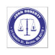 Frimärke med en rättvisesymbol och rund returadress.