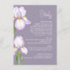 Inkapslingskortdetaljer för bröllop har en raffinerad, minimalistisk stil. Ömtåliga iris i mjuk lila nyans syns mot en pastellbakgrund och skapar en atmosfär av sofistikering och stillhet. Designen är modern, luftig och perfekt för ett stilrent, romantiskt bröllop.