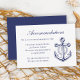 Sätt fart för kärlek med elegant nautiskt bröllop-boendekort! Med en klassisk marin blå fästpunkt på en pristine vit arbetsyta kompletterar det här inneslutningskortet på ett vackert sätt dina bröllop-detaljer som är skrivna i snyggt skript och lättlästa typsnitt. Perfekt för nautiskt bröllop, firande i havet och händelser på strandtemat, det är ett måste för sjömän, havets älskare, och alla som söker en aning maritim magi. Få redot att göra en romantisk resa - beställ din resa idag! ⚓
