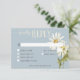 Vi presenterar vårt charmerande bröllop-svarskort med middagsalternativ, designat för att lägga till en liten elegans till din speciella dag. Den här utformandet har en mjuk, dammig blå bakgrund som kompletteras med en delikat vit textruta med en tunn flytande ram. Med den här designen får du en förbluffande sprejning av vattenfärgen vit och gult daisy och delikata blå blommor, och perfekten för firande. Den mjuka nyansen och den gedigna konstruktionen fångar det väsentliga i ett landskap romantik, skapar det som ett idealiskt val. Skapat av Farmhouse Press.