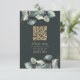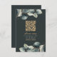 Ett modernt bröllop OSA-kort med djupa gröntar av kol och elegant- eucalyptus löv i muterad grönt och grått-toner. En QR-kod för guld är centrerad för enkla svar på onlineer, med "snälla osa" i ett snyggt skript över en tydlig tidsfrist och instruktioner. Parets namn lyfts fram i guld serif-typen, som skapar ett sofistikerat, naturinspirerat utseende. Kortet blandar bekvämlighet och stil, skapar perfekt för contemporary bröllop med botaniska eller minimalistiska teman. Kontakta mig om du behöver hjälp med att lägga till en QR-kod i ditt eget färg.