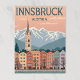 en vektor poster av Innsbruck som visar de färgstarka vintagarna framför Alpernor med tak vid snö. Inkludera en kyrkklocka torn, vintern träd och pastellfärgade himmel. Platt fyllning av använda färg med vintage skuggor: korall, alpblått och beige. "INNSBRUCK" i versaltypsnitt centrerat överst, "AUSTRIA" nedanför i mindre serif.