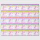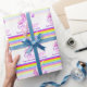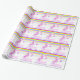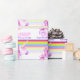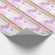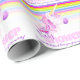 Baby shower för personlig för flickor för regnbåge för stolligunicornkonst som slår in papper. Skräddarsy med ditt egna namn, och meddelandet, läser för närvarande grattis Tracey på din nyfödd bebis. Original- vattenfärgkonstmålning och grafisk design av Sarah Trett. www.sarahtrett.com för www.mylittleeden.com