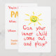 Det roliga partyet som inbjudan frågar ", kan ditt inre barn komma ut och leka?", på bekläda, och kan personifieras med din egna text på baksidaen!