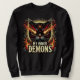 En djärv och konstnärlig design med en hård katt ansikte med lysande filamentwhisky, belyst ögon och en subtil halo, åtföljd av texten "Mina inre demoner"