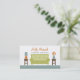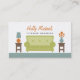 En visitkort för den inre dekoratörn/formgivare som presenterar en grön soffa mellan bruntet, avslutar bord med en vas av blommor och en lampa. Golv är blått. Personifiera texten beklär och drar tillbaka på.