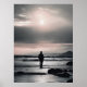 Ett minimalistiskt konstverk som föreställer en ensam figur vänd mot havets vidd, med dämpade och kalla toner som speglar melankoli. Den avlägsna horisonten antyder isolering, medan ljuset och skuggan förstärker känslan av tomhet.