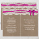 Uppsamlingen av den rustiska rosan bröllop är en bedövande utformning med en vacker, strålande, kompakt bakgrund med en romantisk vintage, vit snöre-effekttrim och en bedövande rosa-båge. Dessa program kan vara personlig för ditt särskilda tillfälle och skulle göra perfekten för bröllop, möhippor, förlovningsfester, födelsedagsfester och mycket, mycket mer. *Observera att Zazzle endast säljer tryckta produkter så att den här artikeln inte har något riktigt material för att dölja snöre eller band/ bågar.