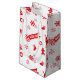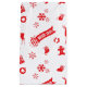 En presentpåse med en röd, sömlös upprepning av julklapp - inslag, magnetbröd, snöflingor, renar, prydnadsföremål, ljus, Julgran och ord "God jul" - som illustration.