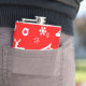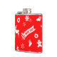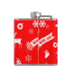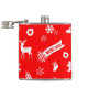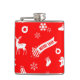En spritkolv med en vit, sömlös repetition av julklapp inslag - strumpor, gingbreadman, snöflingor, renar, julprydnader, ljus, Julgran och ord "God jul" - mot en röd bakgrund.