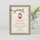 En inbjudan till utomhusbröllop med ett vildmarks-/campingtema med en illustration av en röd oljelampa som hänger från ett träd-gren med löv från grönt. Bakgrunden på framsidan och baksidan är inkapslad. Framsidan har snöre-inspirerad design. Anpassa texten med din information.