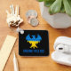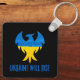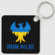 En inspirerande nyckelkedjedesign som påminner om det ukrainska folkets återhämtningsförmåga, har en foenix-fågellsiluett i färgen blått och gult i Ukrainas flagga med "Ukraina kommer att stiga upp" text i ett bedrövligt typsnitt mot svart bakgrund