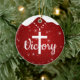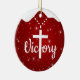 Inspirational Victory Cross Christian Decor Ceramic Ornament, perfect for the Christmas season or as a thoughtful Xmas gift. The front features the white cursive word "Victory" where a large Cross on a beaded necklace replaces the letter T, set against a berry red background with a light sparkle that mimics a gentle winter snowfall, complete with a snow-capped effect. On the back, the same background showcases the sacred writing from the Bible verse John 3:16: "For God so loved the world, that he gave his only begotten Son, that whosoever believeth in him should not perish, but have everlasting life," rendered in white customizable text for a personal touch. This religious hanging decoration embodies faith, holy spirit, and uplifting worship, drawing from Christ teachings and divine passages in the testaments. As a devotional keepsake or present marker, it's ideal for expressing doctrine and the word of our Lord during the winter season. Make it your own with editable, personalizable elements to create a custom sacred memento that's both inspiring and festive. Plus, transfer this versatile sacred motif to your choice of many products on Zazzle, from mugs to apparel, for endless inspirational options. Personalize today and bring a touch of divine joy to your holiday tree or home!