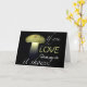 Denna design har min närbildsfotografi av en lysande keramisk solmössa med vattendroppar på en mörk kväll med ett inspirerande budskap "Om du ÄLSKAR vad du gör syns det!" Insidan erbjuder en rad malltext som du enkelt kan ändra eller behålla för varje speciellt tillfälle. Du kan också ta bort hälsningen på insidan och lämna plats för en handskriven hälsning. Du kan också lägga postkortet i en ram med en passepartout som en presentidé. Design & Fotografi ©Patricia AZ Phillips