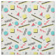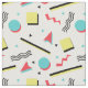 Roligt tyg som presenterar den sagolika 90-tal inspirerat mönster med, cirklar, trianglar, kvadrerar, och annat formar i korall som är röd som är gul, turkos och svart.
